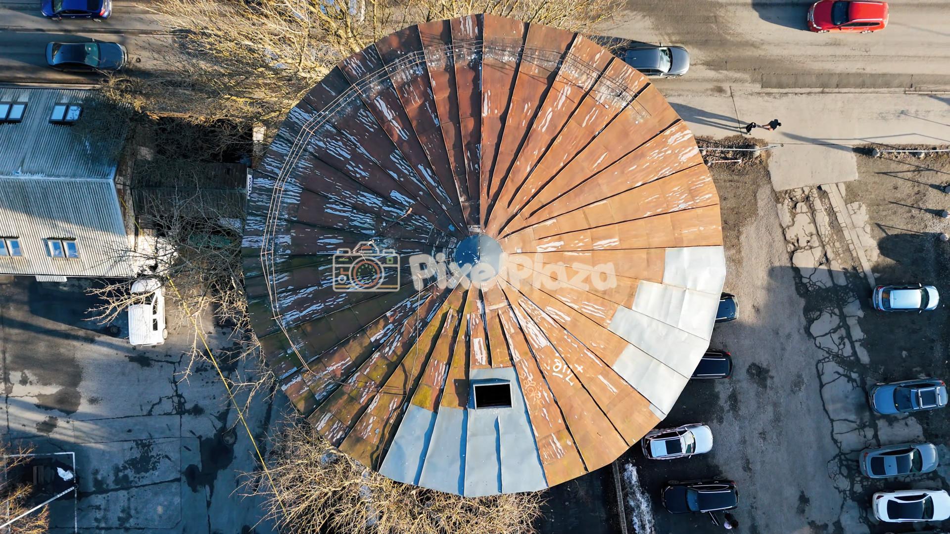Ülalt-alla tehtud droonivaade roostes ümmargusele tööstushoone katusele Telliskivi Loomekvartalis Tallinnas. Linnaarhitektuuri muster, kus ajaloolist ehitist ümbritsevad autod ja tänavad.