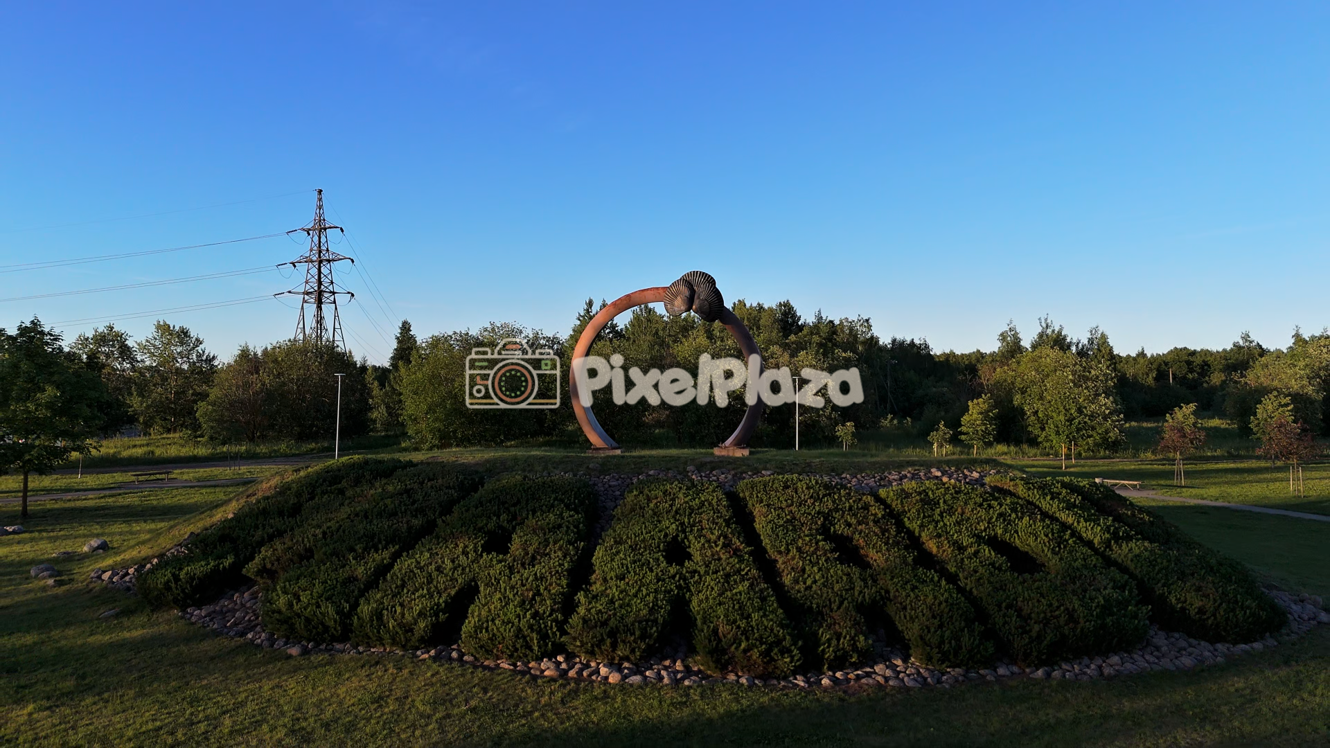 Drone view of Maardu’s iconic sculpture and landscaped greenery captured at golden hour, highlighting nature, design, and urban identity for commercial and editorial use.