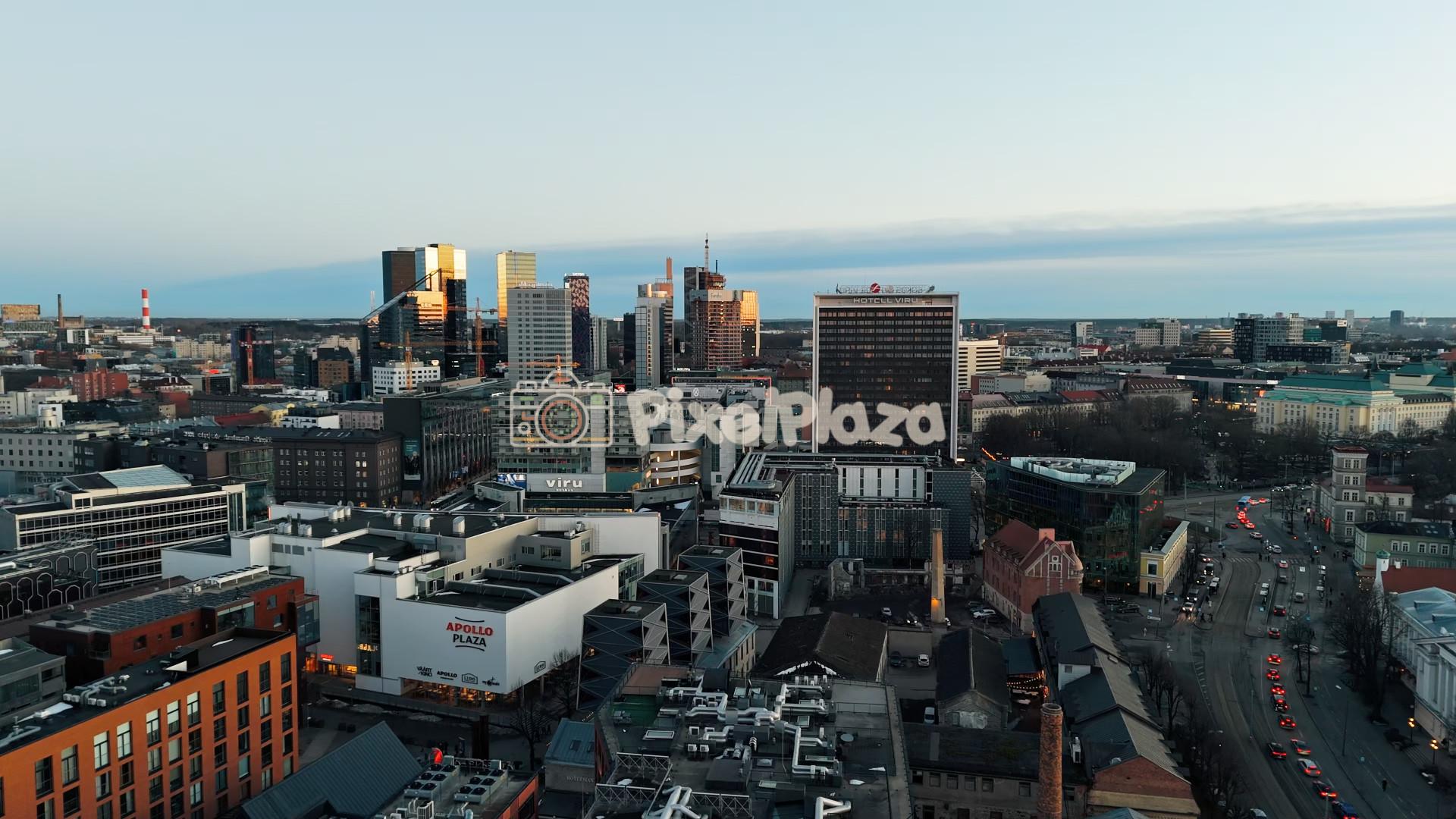 Drone aerial view of downtown Tallinn, Estonia featuring the Viru Hotel, modern skyscrapers, shopping centers and busy city streets during evening light.