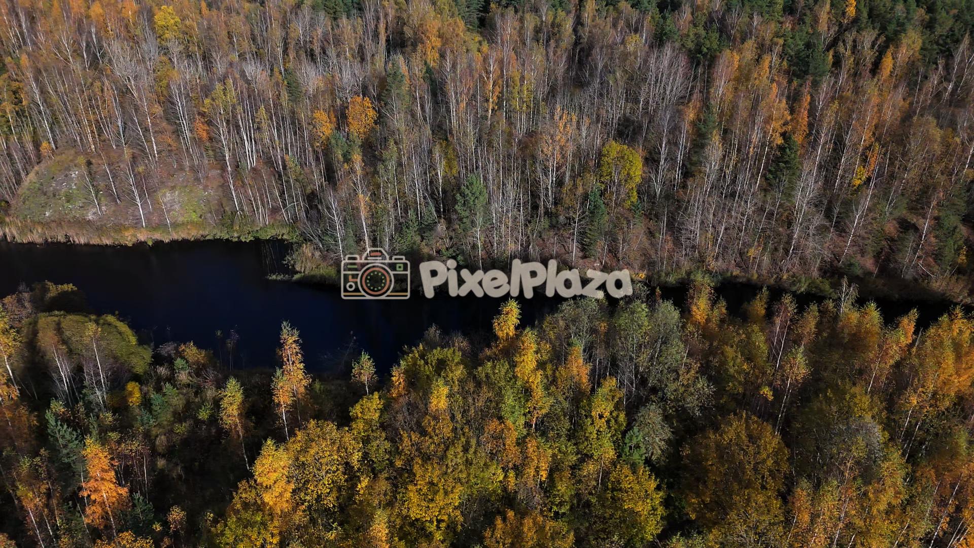 Breathtaking drone view of Estonia’s autumn forest and winding river, showcasing vibrant fall colors, natural beauty, and serene wilderness. Perfect for travel and nature stock footage.