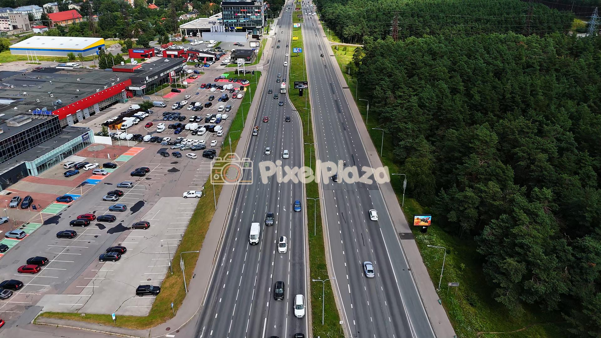 Drone view of a modern highway surrounded by forests and shopping centers in Tallinn, Estonia — showcasing urban life and infrastructure development.