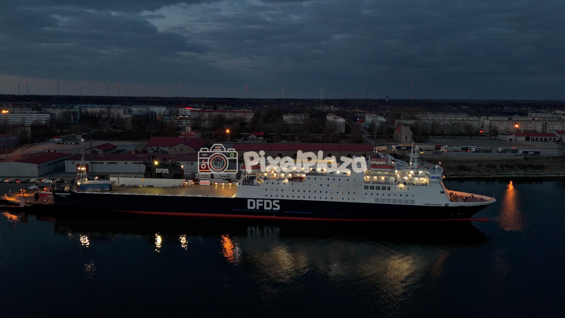 Aerial drone view of DFDS ferry docked at Paldiski port in Estonia at dusk. Illuminated passenger and cargo ship with reflections on calm water highlighting Baltic Sea maritime transport and logistics.