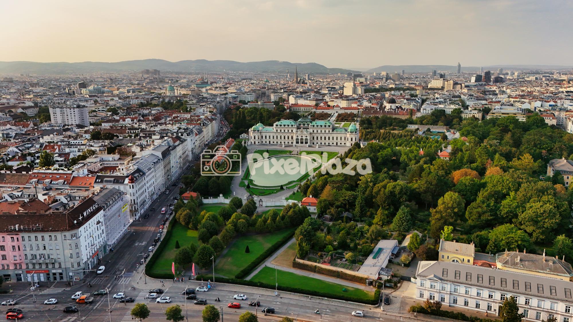 Drone view of the majestic Belvedere Palace and the historic city of Vienna, Austria, captured from a unique aerial perspective at sunset.