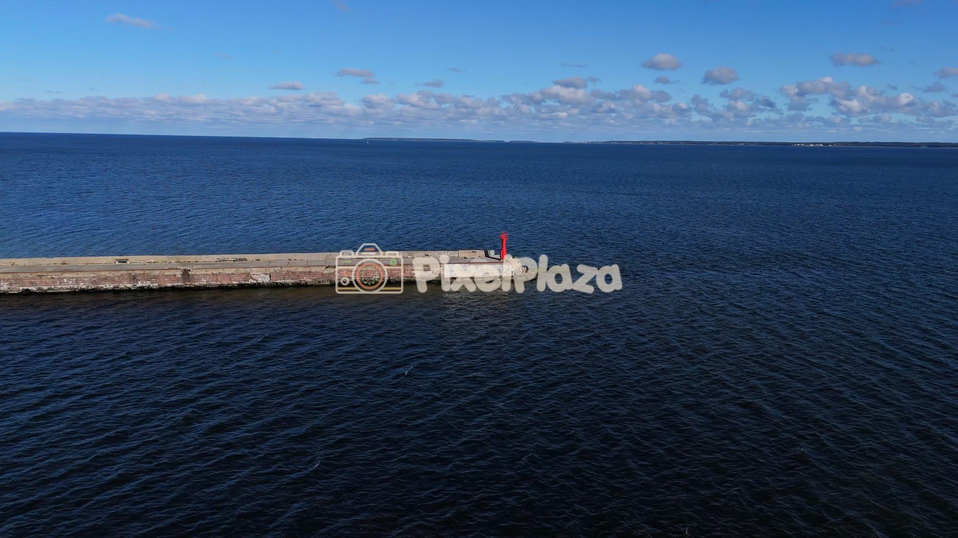 Aerial view of Katarina Quay with red maritime beacon and calm Baltic Sea in Tallinn, Estonia on a clear sunny day with blue water and wide horizon.