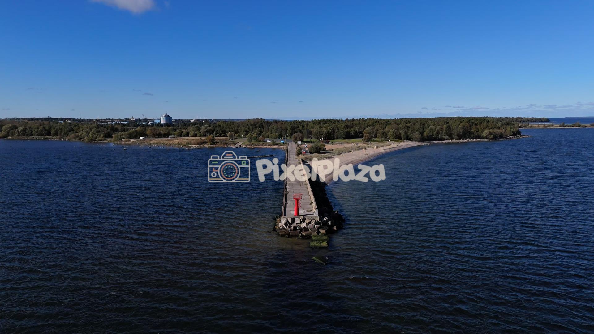 Aerial view of Katarina Quay in Paljassaare, Tallinn with red beacon, sandy beach, forest shoreline and calm Baltic Sea on a clear summer day.