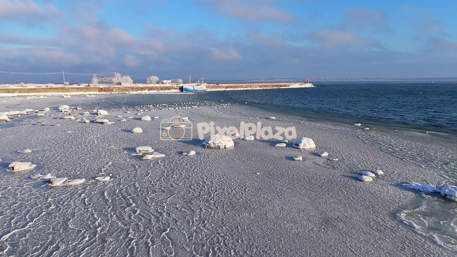 Winter drone view of the frozen Baltic Sea coastline at Paljassaare, Tallinn, Estonia, featuring icy shorelines, calm blue water, harbor structures, and a crisp Nordic winter atmosphere.