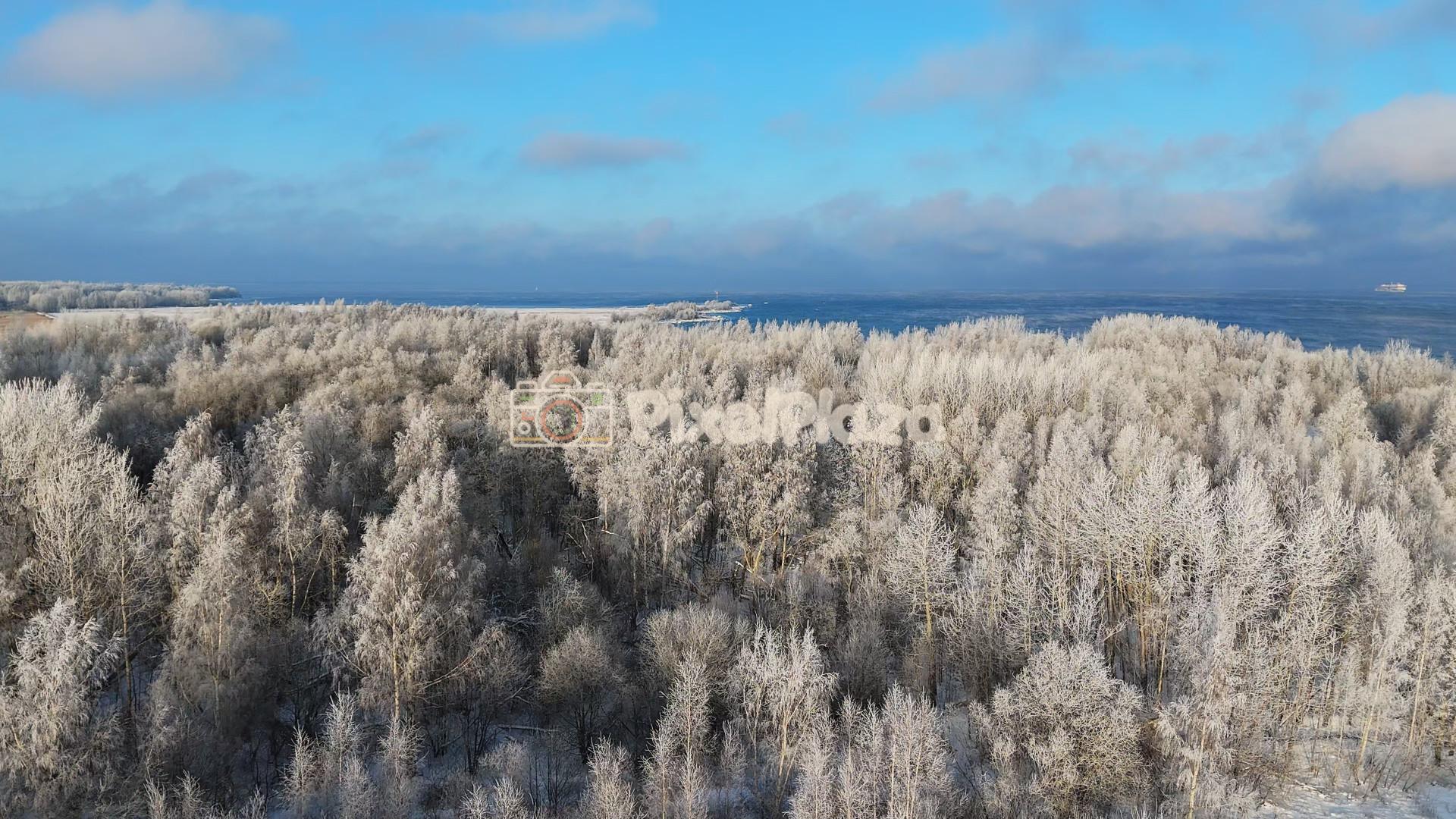 Aerial winter drone view of frost-covered coastal forest in Paljassaare, Tallinn. Icy trees meet the Baltic Sea under a clear blue sky, showcasing Nordic winter nature.