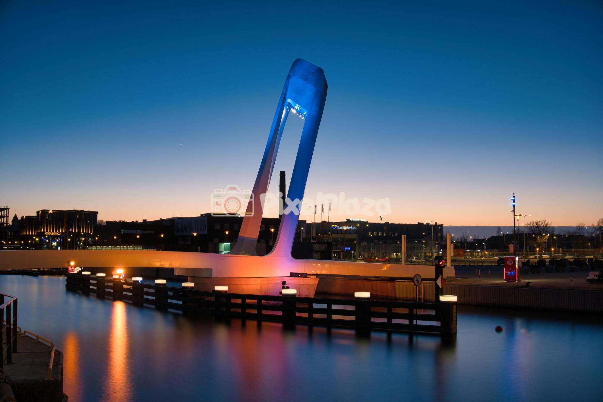 Experience the modern elegance of the Admiral Pedestrian Bridge in Tallinn. This long exposure captures vibrant night lights reflecting on the calm harbour water during twilight.