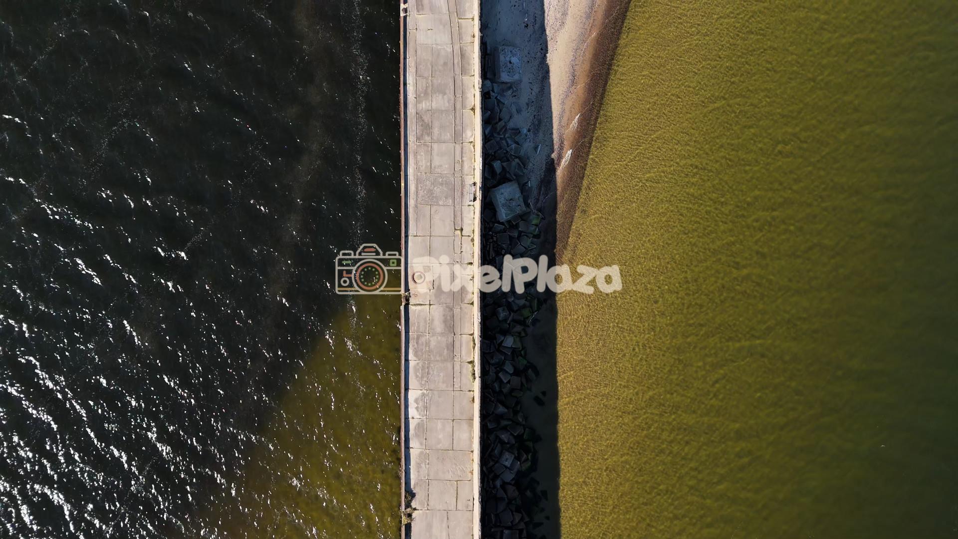 Striking top-down drone view of Katariina Quay, capturing the sharp contrast between dark and golden waters along the concrete pier in stunning geometric detail.