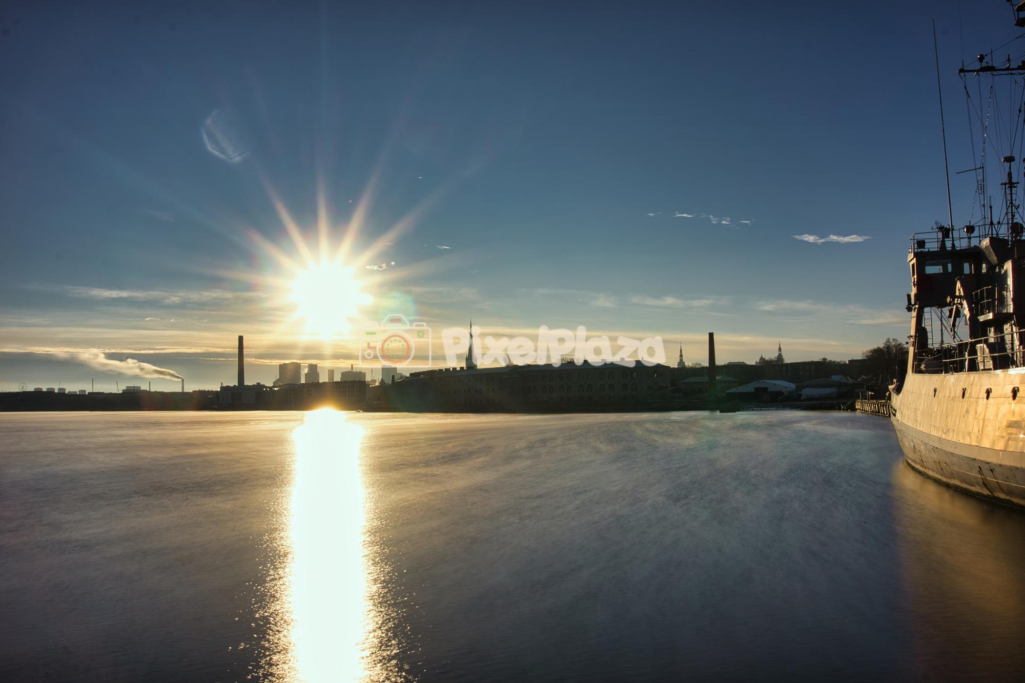 Long exposure view of a powerful sunburst over the Tallinn industrial and historic port skyline with a docked ship and smooth, misty water.