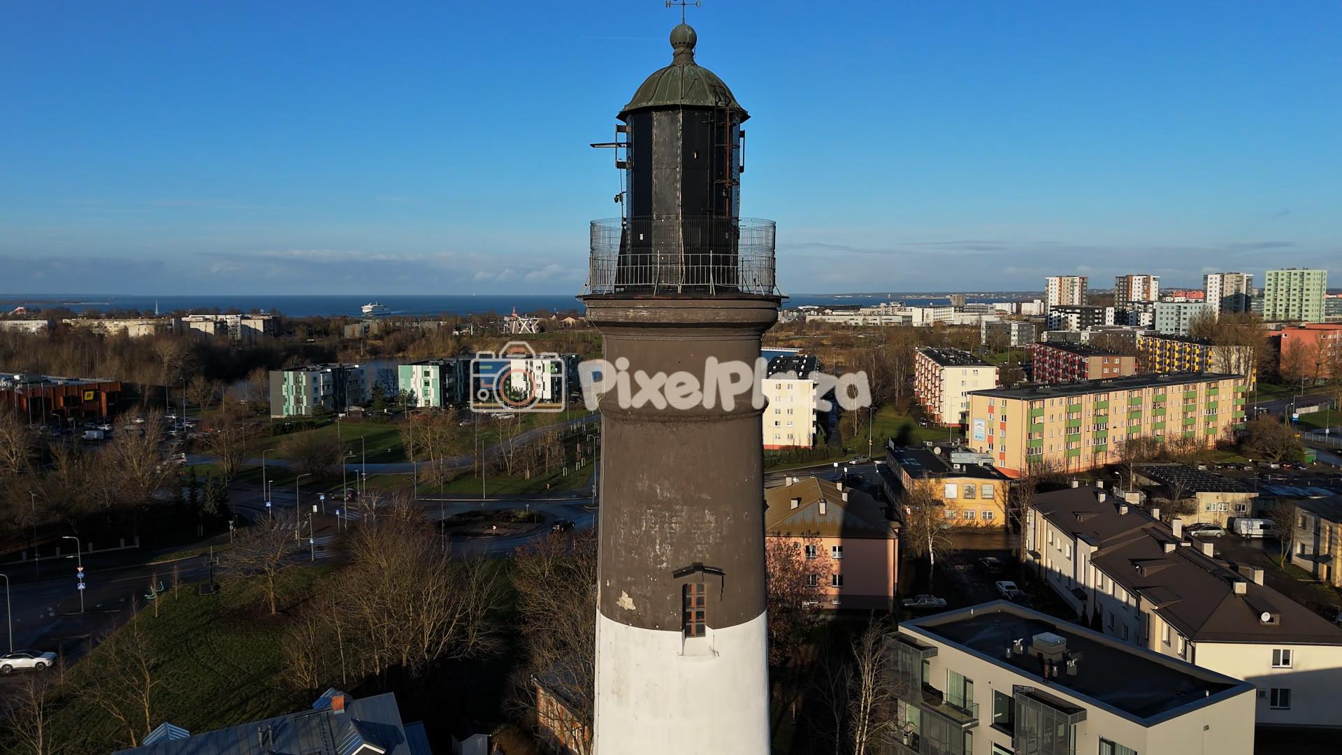 A drone view of the historic Tallinn Upper Lighthouse, towering above modern buildings, with the Baltic Sea shimmering in the distance.