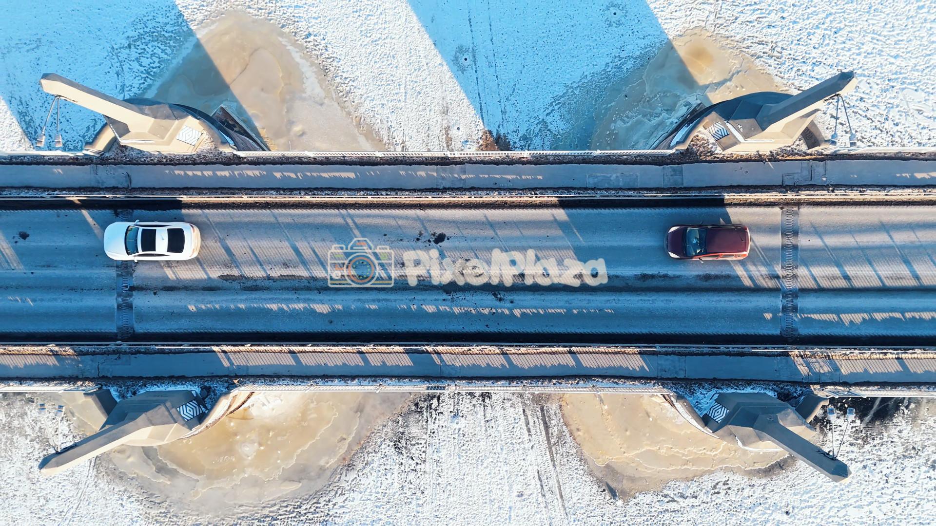 Vertical drone shot of cars crossing Pärnu City Center Bridge over icy river in Estonia – winter urban transport infrastructure with geometric symmetry.