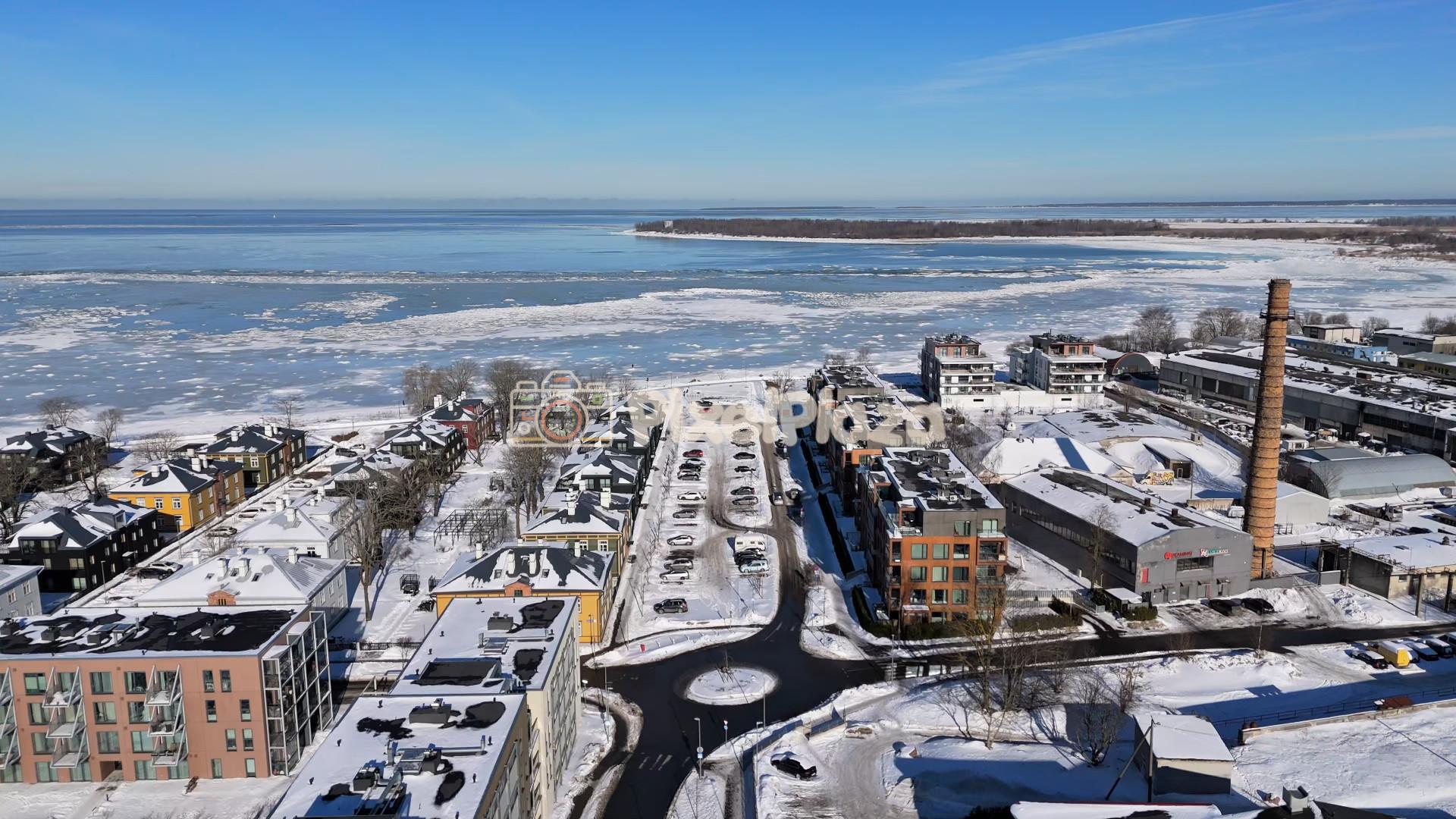 Aerial drone view of snowy Kopli Liinid district in Tallinn, Estonia with frozen Baltic Sea, coastal apartments, industrial chimney and winter cityscape under clear blue sky.
